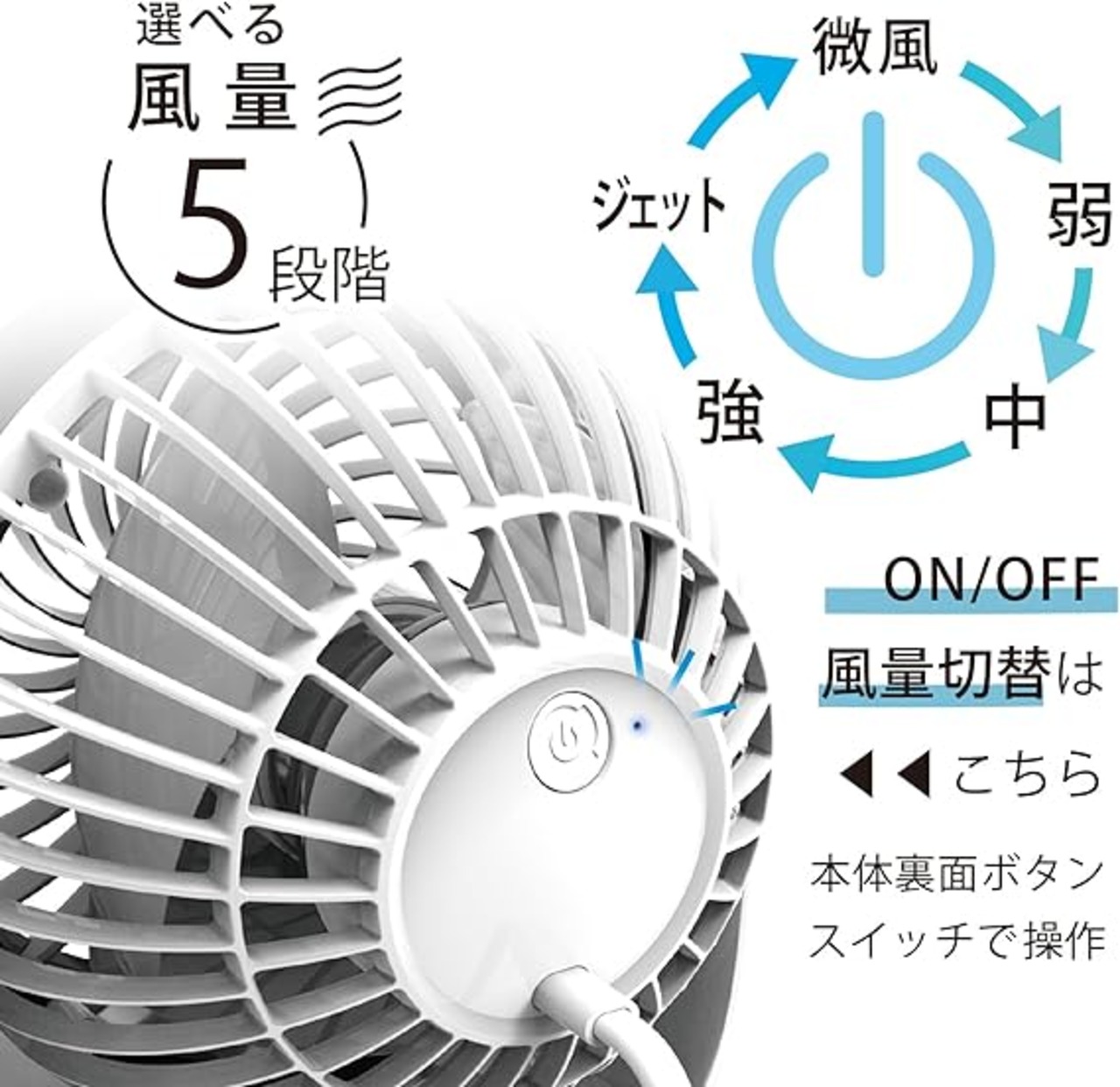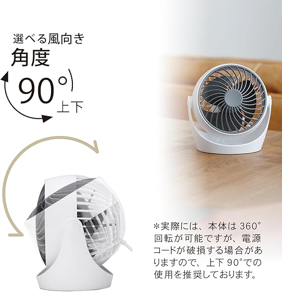 【ACコンセント】扇風機本体にはコンセントケーブルが直結しています。USBタイプではないのでACアダプタに繋げる必要がなく、便利にご使用いただけます。