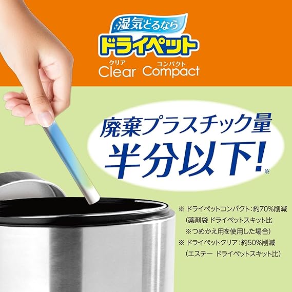 【コンパクトな容器形状】場所をとらずに湿気をとります。薬剤袋を使用しているので、容器の中を汚さず、つめかえが簡単です。