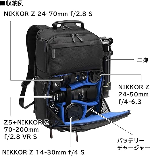 収納目安はミラーレスカメラにレンズ2−3本 、 D780クラスのボディにAF-SVR80-400mmを装着したサイズまで収納可能です。