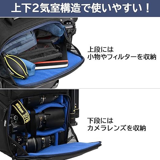 上下2気室構造により下段にはカメラ機材の収納。上段には普段持ち運ぶ外出時の荷物の収納にも便利です。