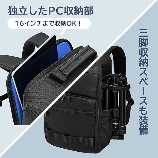黒を基調としたシンプルなデザインにカメラバッグならではの多様な機能性を兼ね備えたカメラリュックです。