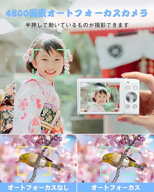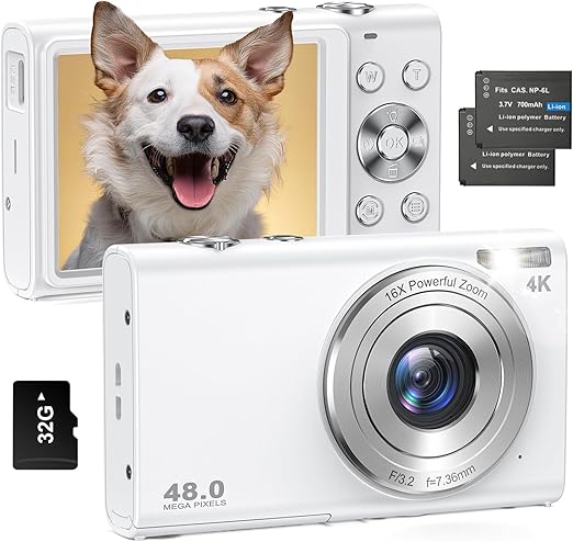 CAMKORY 4K デジカメ デジタルカメラ オートフォーカス 4800万画素 4K解像度 近接撮影 16倍デジタルズーム 2.8インチ大画面 予備電池 軽量 修学旅行 学生 初心者 ホワイト a