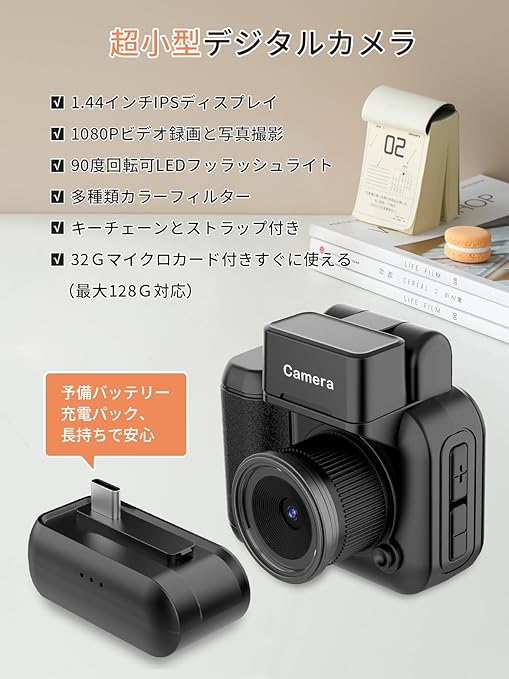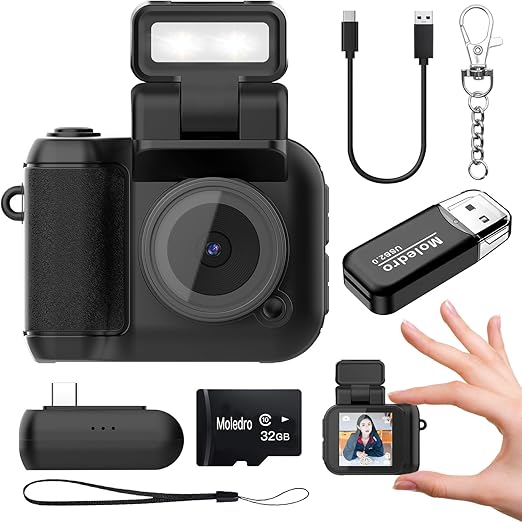 Moledro 超小型デジタルカメラ ミニカメラ デジカメ 1080Pビデオ 200万画素 32GBマイクロSDカード付き 充電ベース付き 1.44インチ画面 27g LEDライト 多種類フィルター 軽量 携帯便利 キーホルダーセット コンデジ 初心者・子供向け キーチェーン付き(ブラック) a