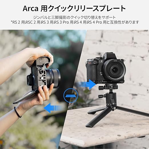 【Arca 用クイックリリースプレート】 Arca-Swiss クイックリリースプレートが統合されており、Arca タイプの三脚、ハンドヘルドセットアップ、DJIに対応 RS2用、RSC 2用、RS3用、RS3 Pro用、RS4用、RS4 Pro 用スタビ