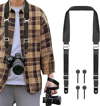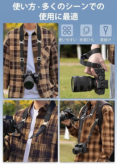 【多機能·優れたデザイン】3in1多機能カメラストラップ。3つのパーツで構成され、2本のカメラ用手首ストラップとしても使えるほ