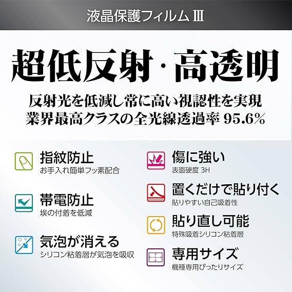 超低反射の液晶画面保護フィルム。従来品より更に向上した全光線透過率は業界最高クラスの95.6%を実現。信頼の日本国内製造。