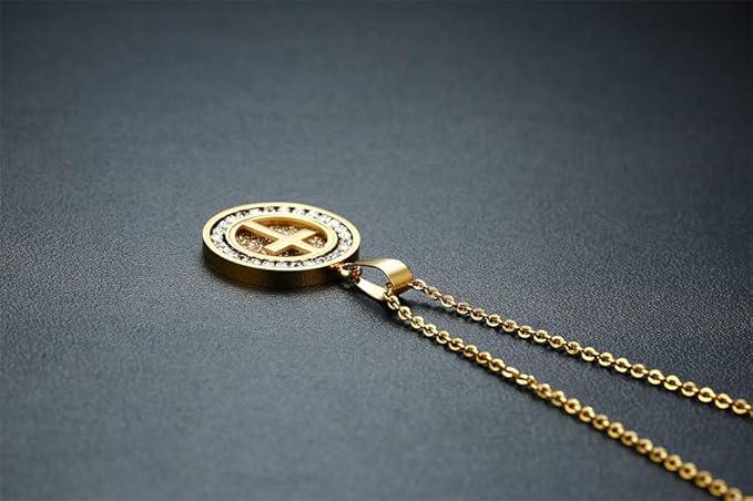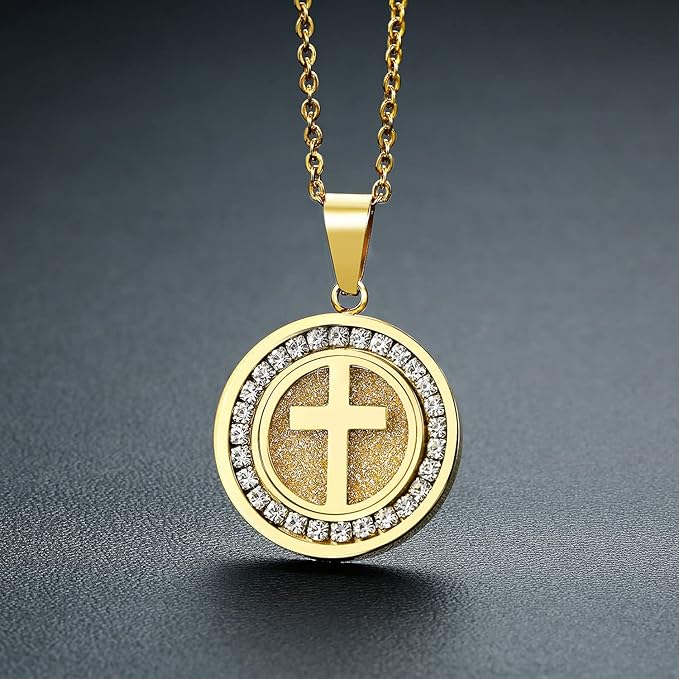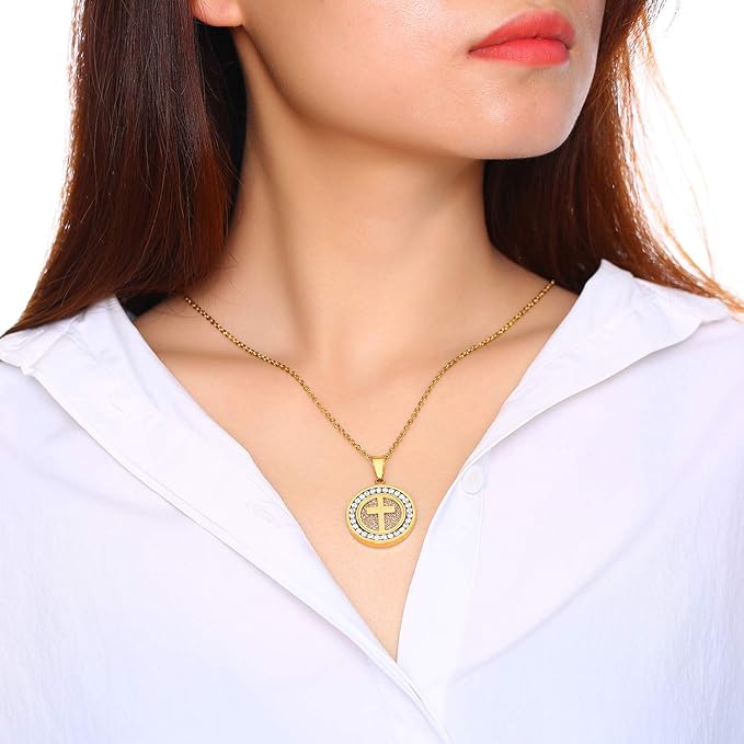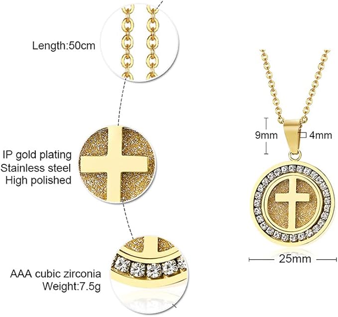 Rockyu コインネックレス ゴールド 18金 チタン ジルコニアcz 十字架 円形 メダル ペンダント 仕上げ レディースネックレス お守り 厄除け 開運 宗教風 記念日 ファッションアクセサリー a