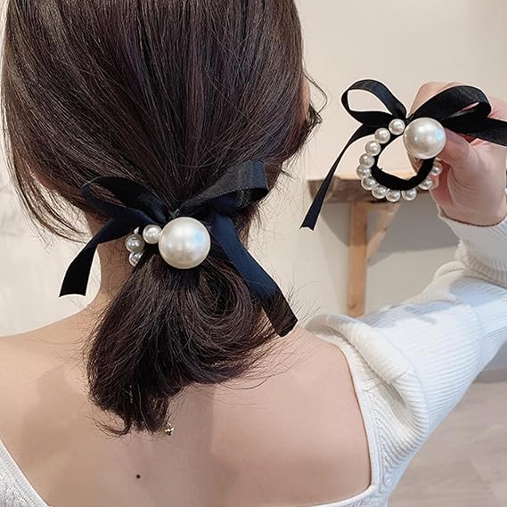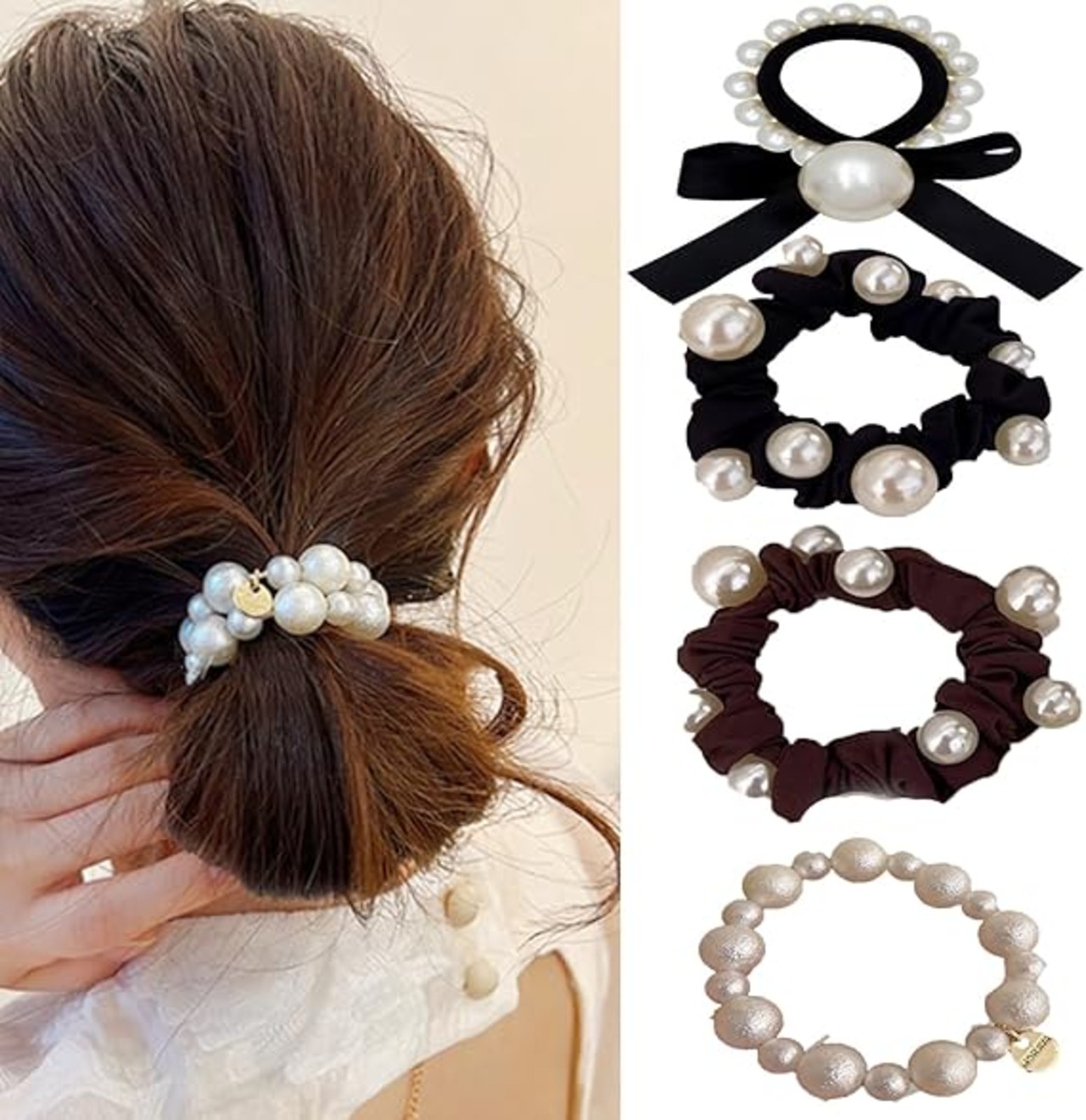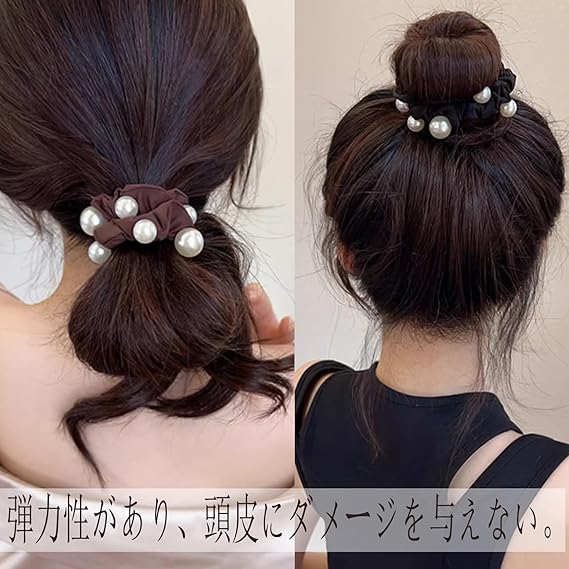 HAPVITAL シュシュ シフォン シュシュ おしゃれ 大人 ヘアロープ 大きめ 無地 ヘアゴム 大人 髪飾り 特大 ヘアアクセサリー エレガント サテン シンプル (パール4点セット) a