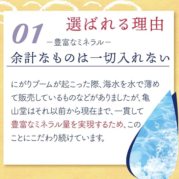 亀山堂のにがりは原液のまま販売しているので、にがりに含まれるミネラルがそのまま含まれています。