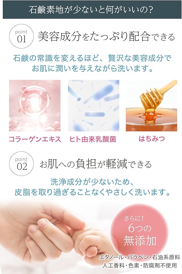 皮膚常在菌のバランスを整える乳酸菌をはじめ、石鹸とは思えないほど美容成分 (50%以上)を贅沢に配合した、やさしい洗浄力の石鹸です。 洗い過ぎない処方で乾燥や肌荒れの気になる方にも!