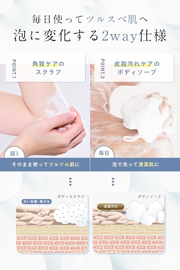 【 2way仕様で毎日使える 】泡に変化するから「スクラブ」だけでなく「ボディソープ」としても使えます。 ①スクラブ:そのまま使って角質ケア ②ボディソープ:泡で洗って皮脂汚れケア