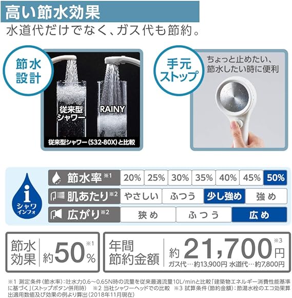 SANEI(サンエイ) シャワーヘッド レイニー 手元ストップ 節水率50% 極細水流 勢いアップ ステンレスシャワー板 ホワイト 日本製 PS313-80XA-WA2 a