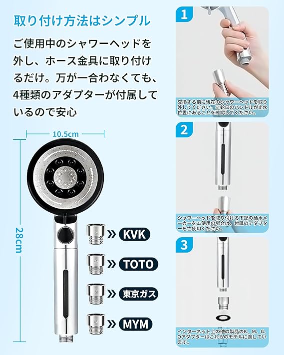 【二重浄水機能・手元止水】浄水カートリッジとPP綿の2重浄水機能があるため、水道水に含まれる重金属、浮遊粒子、サビ、泥などを濾過して、有効に除去できます。(浄水カートリッジは交換可能で、定期的に交換することで長期間使用することができます。)手元止水機能(しゃわーへっどのハンドルには水スイッチが付いているので、お湯のオン・オフを自由に切り替えることができ、スイッチオフによる湯温の熱さ・冷たさを全く気にする必要がない、とても気の利いた設計です!)。