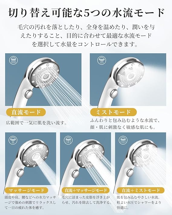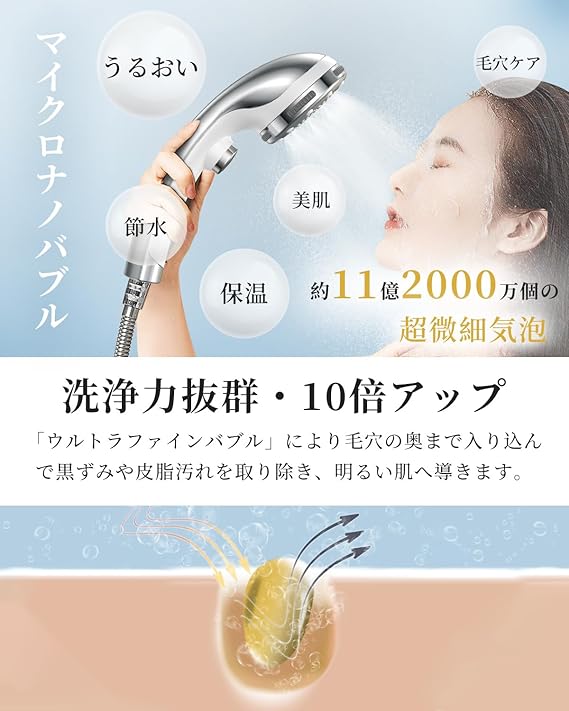 【最新モデル・数億級までのナノバブル&洗浄力抜群】:マイクロナノバブルシャワーヘッドの効果とは「洗浄力」のこと。数億級まで達する超微細気泡が発生できるこのシャワーヘッドは、毛穴の奥の汚れを効果的に取り除け、肌を清潔に保つ効果が期待できるため、肌のケアに適しています。特にミストモードでは霧のように細かく、顔を洗っても刺激なく、お年寄りや子ども、女性にもおすすめ。また、水圧調整も肌への刺激性も向上し、洗浴中に水分が肌から奪われず、肌が乾燥しづらくなります。お湯の温度を長く保ち、より長い入浴時間を楽し
