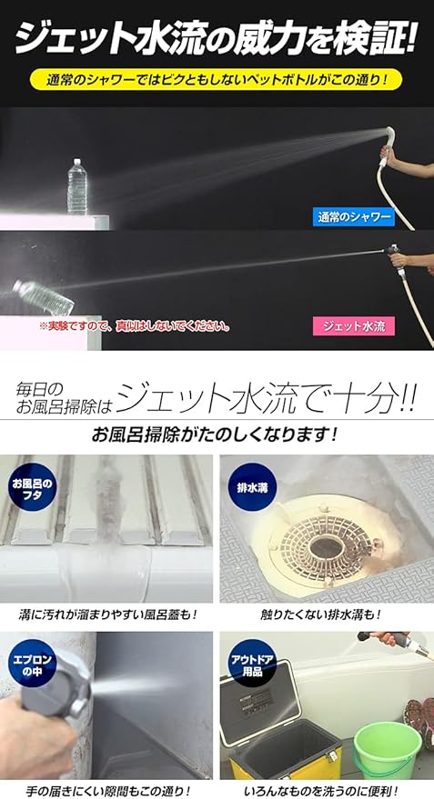 「溝に汚れが溜りやすいお風呂のフタも」「触りたくない排水溝も」「手の届きにくい隙間も」「お風呂場以外の洗浄にも」ジェット水流があれば全てOK!