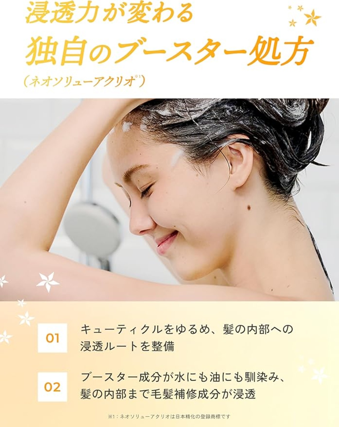 ブースター(*3):美容液成分(*1)の髪内部への浸透(*4)を促進する*1 加水分解ケラチン(羊毛) (毛髪補修成分) *2 化粧品原料