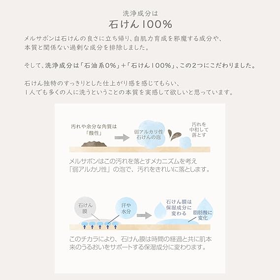 洗浄成分は石けん100%。石けん特有の「石けん膜」が、時間の経過と共に肌本来のうるおいをサポートする保湿成分に変わります。