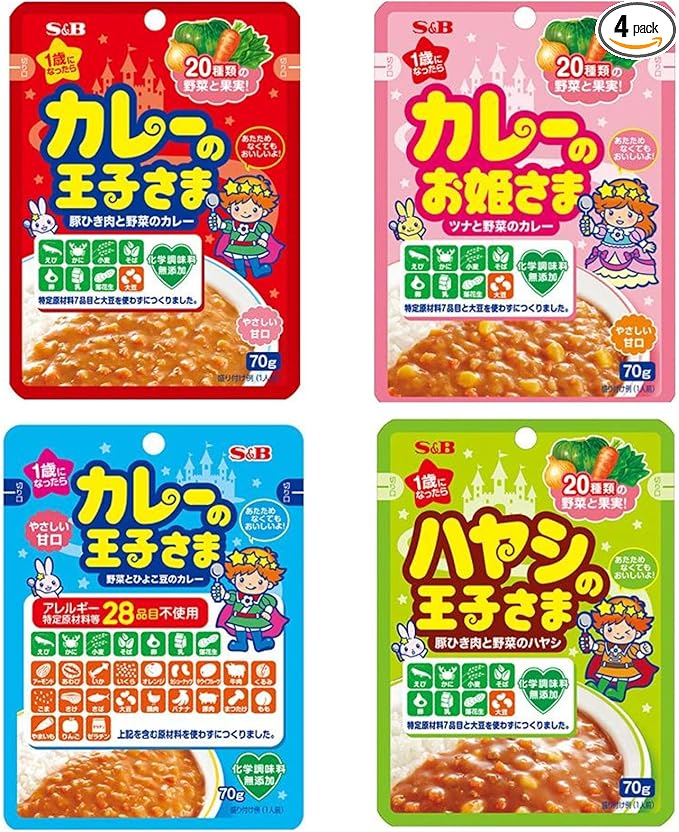 S&B エスビー カレーの王子さまレトルトシリーズ 4種お試しセット(カレーの王子さま(豚ひき肉と野菜)・カレーのお姫さま・ハヤシの王子さま・カレーの王子さま(野菜とひよこ豆))全4食 1歳から食べれる 甘口 化学調味料無添加 特定原材料7品目不使用 大豆不使用 子ども用 幼児用 非常食 保存食 防災対策 長期保存 4食分 a
