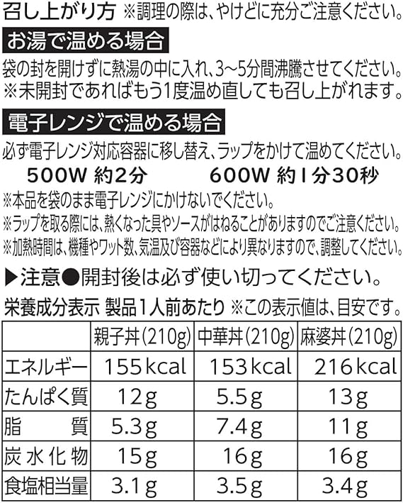 原材料:[親子丼] 鶏肉(国産)、鶏卵、玉ねぎ、発酵調味料、エキス(チキン、鰹節、酵母、鰹)、砂糖、食塩、醤油、たん白加水分解物、鶏脂/増粘剤(加工でん粉、キサンタン)、調味料(アミノ酸等)、トレハロース、乳酸カルシウム、カロチノイド色素、(一部に卵・小麦・大豆・鶏肉を含む)|