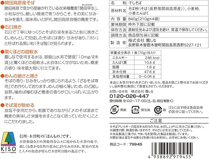 長野県木曽郡開田高原(標高1,100〜1,300m)の在来種蕎麦「開田早生(かいだわせ)」を使用した乾そば。