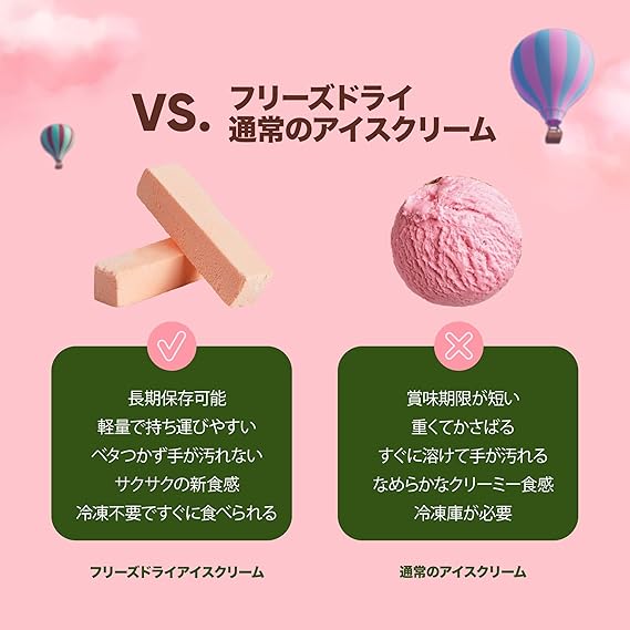サクサク食感の爽やかストロベリーアイス。フリーズドライ製法により、苺の甘酸っぱさとクリーミーな味わいをぎゅっと閉じ込めました。軽やかな食感で、お口の中でふわっと溶ける新感覚スイーツです。