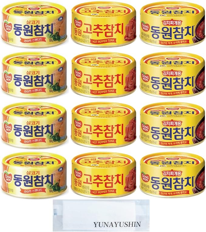 韓国ツナ缶 東遠 ツナ 3種類 12個 YUNAYUSHIN お手拭き付セット | ツナ缶 100g 唐辛子ツナ缶 100g キムチチゲ用ツナ缶 100g 各4個ずつ 合計12個 | 食卓をもっと美味しくする おかず感覚のツナ缶 非常食 保存食 【商標登録番号 第6684394】 a