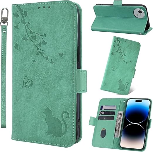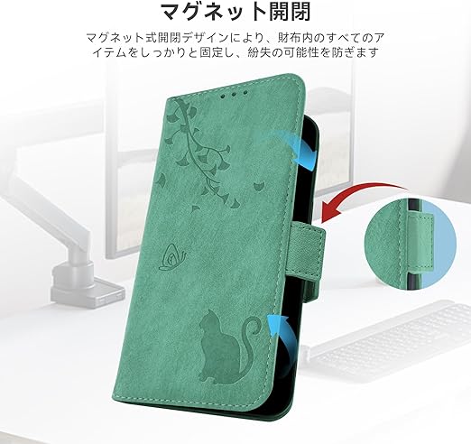 Aquos wish5 ケース 手帳型 アクオスwish5 ケース 手帳型 ウィッシュ5 カバー おしゃれ 財布型 スマホケース 人気 上質 Jajaful アクオス ウィッシュ5 携帯カバー 耐衝撃 マグネット式 スタンド機能 カード収納 PUレザー 軽量 猫 グリーン a