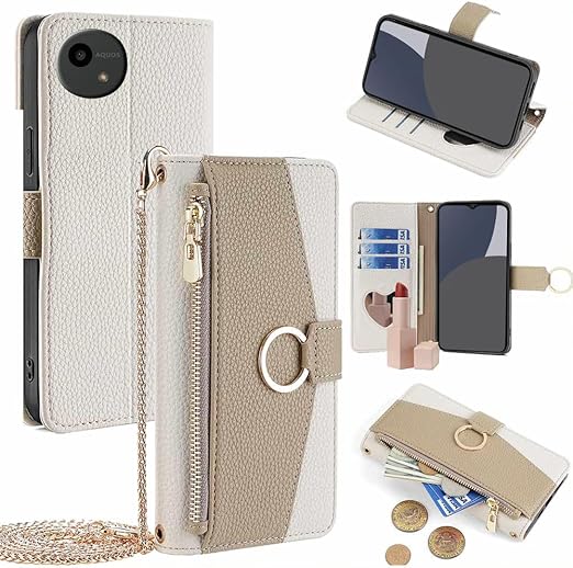 Aquos wish5 ケース 手帳型 アクオスwish5 ケース 手帳型 アクオスウィッシュ5 携帯カバー ショルダー ストラップ付き スタンド機能 カード収納 ミラー付き 耐衝撃 肩掛け おしゃれ 女性 柔らかいTPU TOO&SOO Aquosウィッシュ5 スマホケース 斜め掛け - オフホワイト a