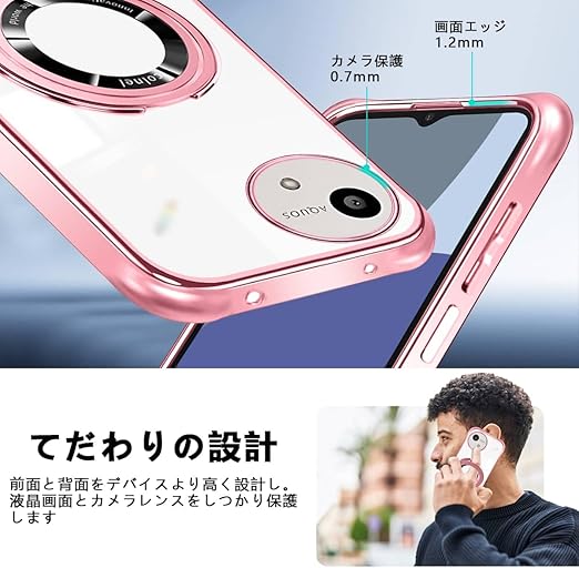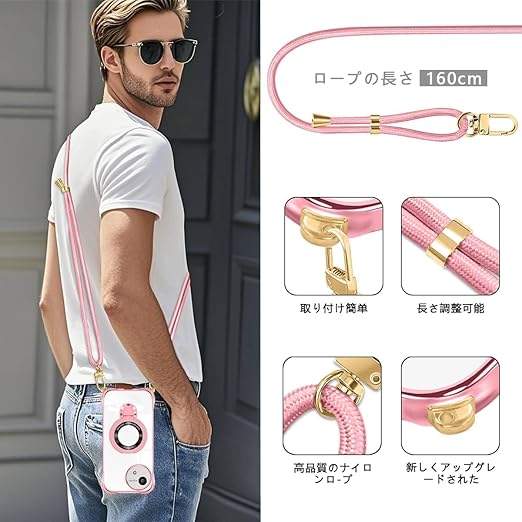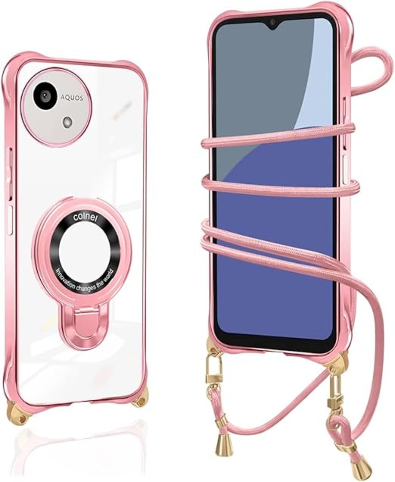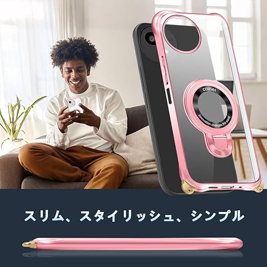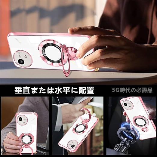 AQUOS wish5 ケース クリア ショルダー 透明 リング付き スタンド機能 wish5 スマホケース マグネット搭載 aquos ウィッシュ5 カバー 120度反転スタンド 耐衝撃 米軍規格 紐付き 斜めがけ 織りストラップ付き ネックストラップ ショルダー 縦/横 2WAY 長さ調整可能 取り外し可能 落下防止 紛失防止(ローズゴールド) a