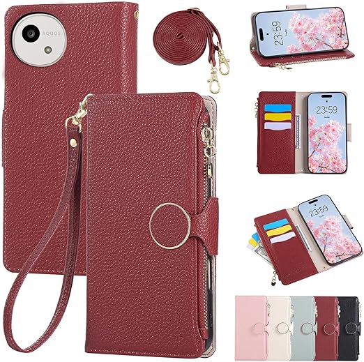 Rosbtib Aquos wish5 ケース 手帳型 アクオスwish5ケース ショルダー 財布型カバー アクオスウィッシュ5 カバー おしゃれ ファスナー型 小銭入れ カード収納 SH-52F ケース 手首/肩掛けストラップ付 マグネット式 スタンド機能 アクオス ウィッシュ5 スマホケース 可愛い シンプル 女性 人気 肌触り良い 全面保護(レッド) a
