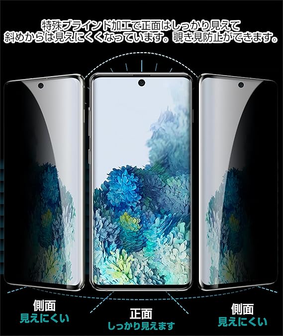 スマートフォンを立てに持った時、180°覗き見防止,画面を左右から覗かれることを防ぐ180° 左右 2方向ブラインド仕様のプライバシー保護フィルムです。周りの視線を気にすることなくLINEやメールのやりとりを行えます。真正面から見ると高透過率ではっきり見えますが、斜めから見るとブラインドルーバーにより画面が段々真っ黒になります。画面内容は勿論、個人情報も完璧守られます。