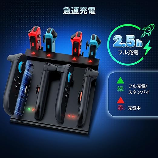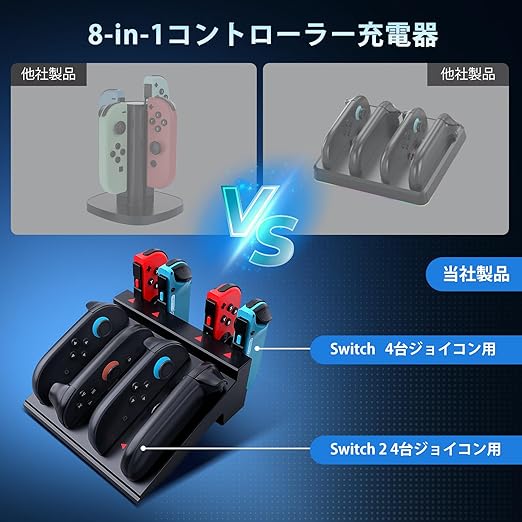 【8in1超急速充電】任天堂Switch2/Switch & Switch有機ELモデル対応 ジョイコンの充電スタンドが登場!このジョイコン 充電スタンドは最新充電技術により、スイッチ 2 ジョイコン用充電スタンド4台とSwitch & Switch有機EL用joy-con4台の計8台をわずか2.5時間でフル充電。このスイッチ コントローラー 充電は従来製品より40%高速化を実現し、8つの独立充電ポートで確実に充電可能。joy-con 充電時、過充電防止機能でコントローラーを保護しながら、友達や