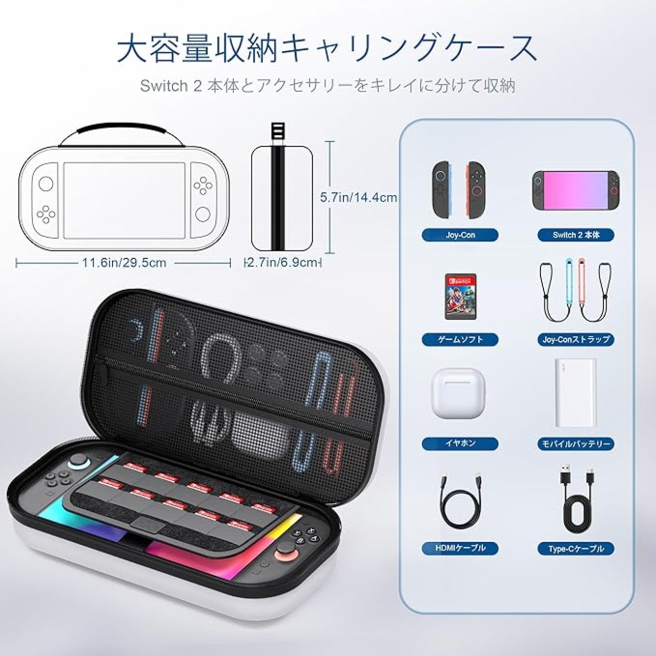 【収納力抜群】Switch 2本体、イヤホン、ゲームカード10枚、充電器と他の小物類を収納できます。カードなどの小さいものの紛失を有効的に防止し、空間も大幅に節約し、部屋の片付けに大変助かります。