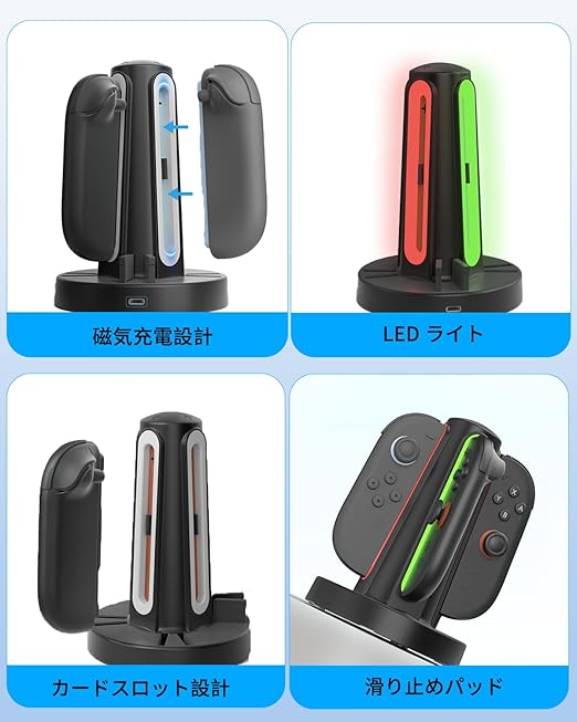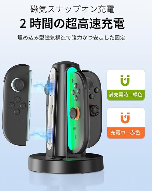 【マグネット装着&2時間高速充電】スイッチ 2 Joyconの接続がマグネットで簡単&確実!4台を同時に約2時間でフル充電。底面には滑り止め付きで、安定性抜群。充電後もスイッチ 2コントローラーをスマートに収納でき、デスク周りもすっきり