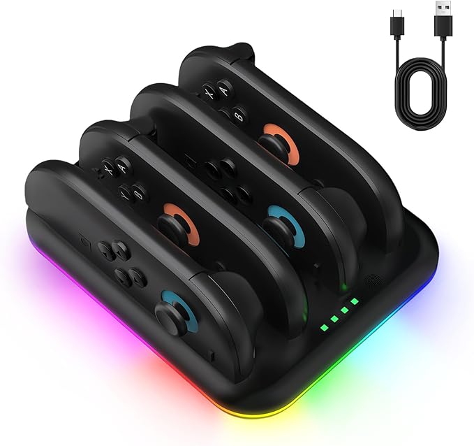 【高効率充電】ジョイコン2 充電器は4つのJoy-consコントローラを同時に充電することができる。充電速度が速く、待ち時間を減らし、急速に電力を補充し、プレイヤーがいつでもゲームに投入できるようにします、ハンドルの電源が切れてゲーム体験に影響