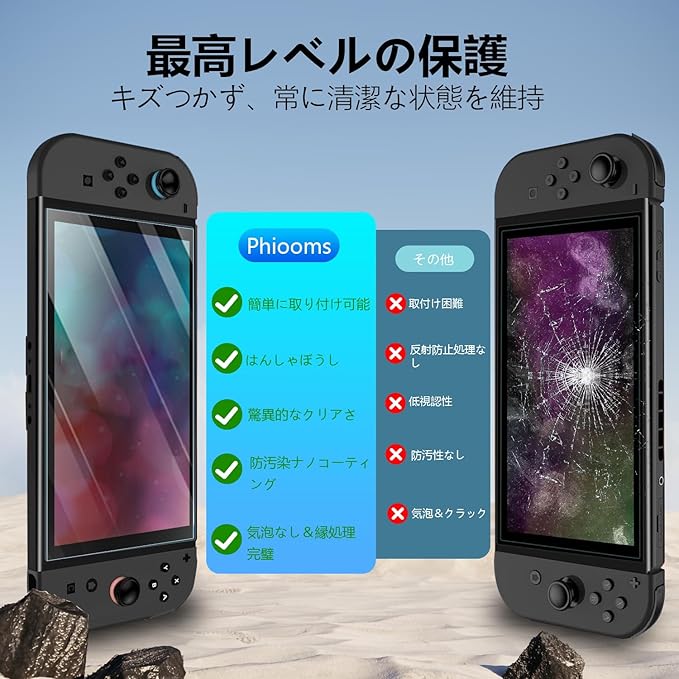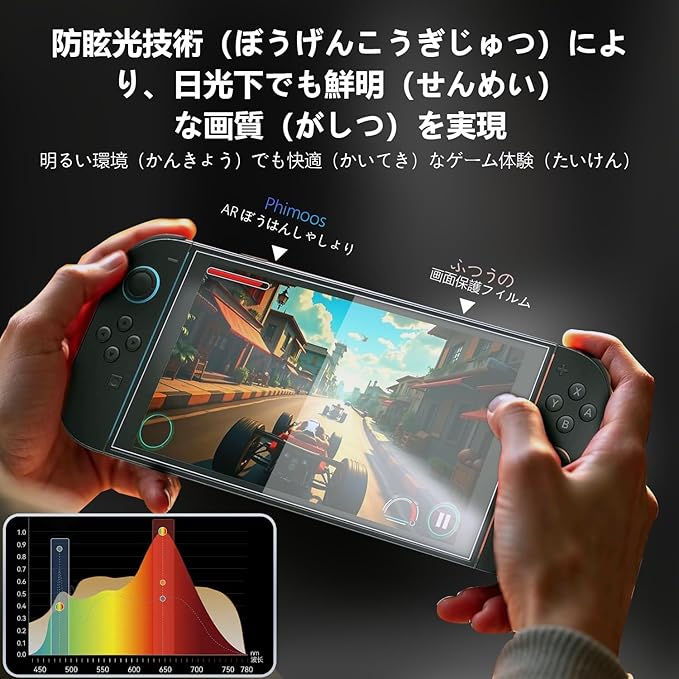 【ARテクノロジー搭載のHDクリアな視界】95%の光透過率を誇るソフトAR反射防止スクリーンプロテクター。鮮明な映像と映り込みの軽減を実現し、ゲーム体験をさらに深めます。PHIMOOS素材は、耐久性を損なうことなく、高