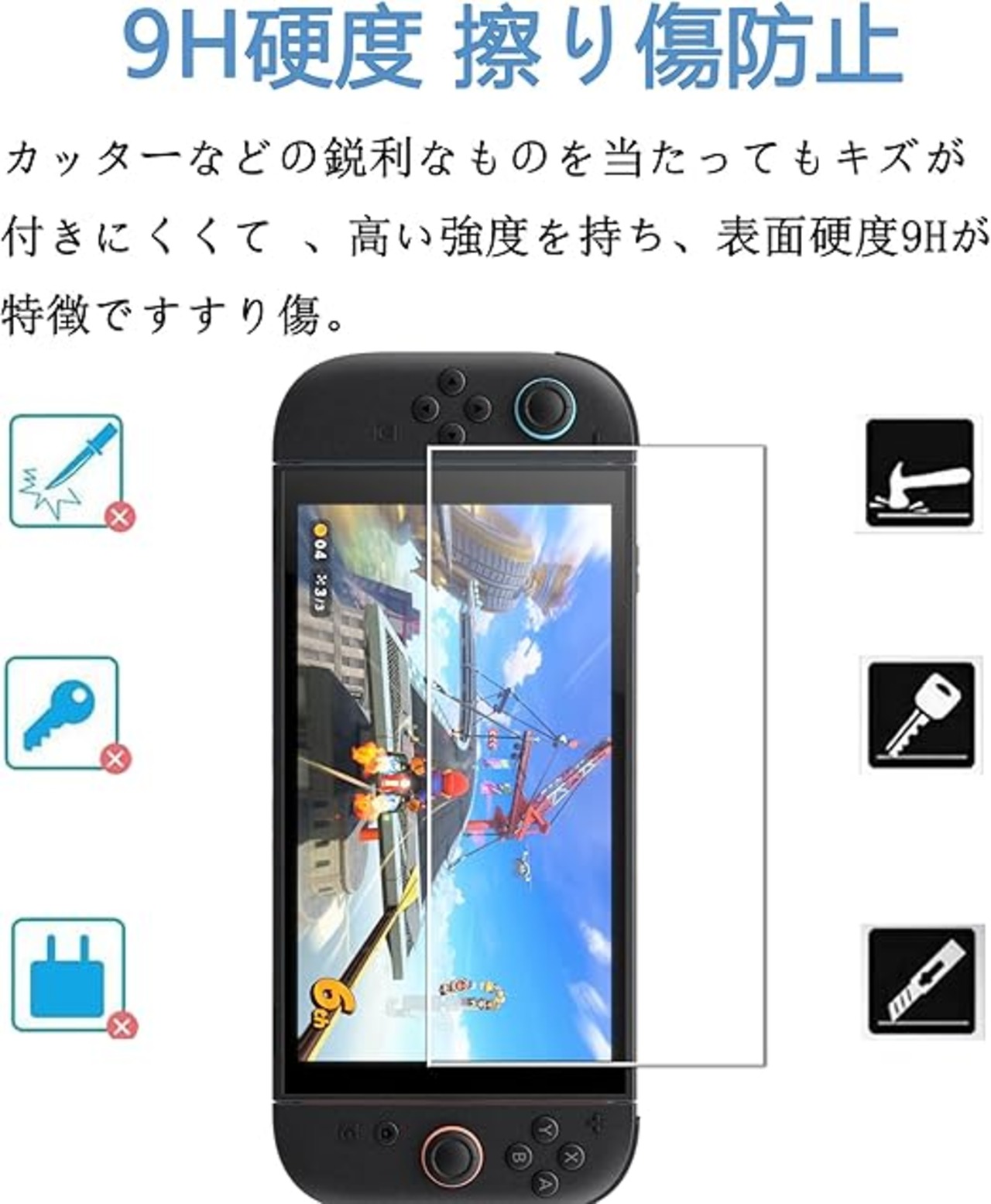 【硬度9H】高品質の 日本旭硝子素材 を採用します、 硬さは業界トップレベルの9Hに達しました、カッターなどの鋭利なものを当たってもキズが付きにく