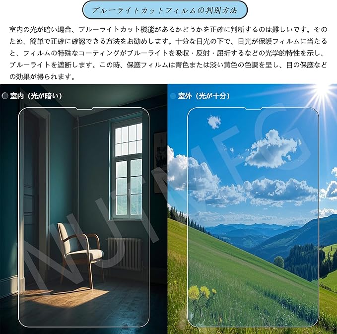 【ご注意事項】:ブルーライトカット技術が採用されているため、室内の光が弱い場所ではブルーライトフィルムの色がほとんど確認できません。そのため、日光の下でフィルムの色を確認することをお勧めします。日光の下では色がよりはっきりと見えます。ただし、使用する角度や環境によっては、フィルムが淡い青色や薄い黄色に見えることがありますので、あらかじめご了承ください