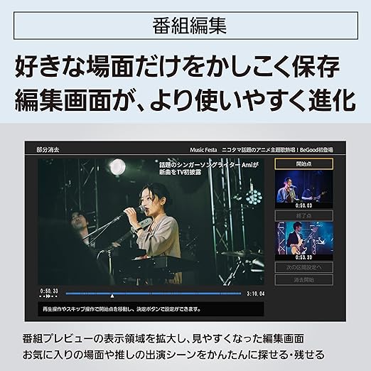 最大10ch×約28日間分、自動録画(※)・自動消去で見たい番組を見逃さない。 ※:6チャンネルのうち、BS・110度CSは最大2チャンネルまで選択可能。録画日数は15倍録モードの場合。自動メンテナンス中は全自動録画や再生、ダビングなどの一部の機能が使えません(毎日5分程度)。全自動録画用のハードディスク容量がいっぱいになると、古い番組から自動で上書き消去します。