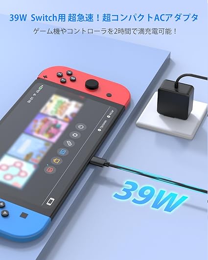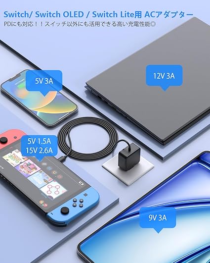 【ゲーム機やコントローラを急速充電】本スイッチ交換用ACアダプターはSwitch付属の純正アダプタと同じ仕様、急速充電規格である「USB PD」を搭載し、最大39Wの急速充電で、Switch本体を1時間で60%、約2時間で100%の充電を行えます。充電機能上は純正と変わりなくドックに接続してTV出力もできます 。入力:100-240V 50-60Hz 1.0A; 出力最大39W: 5V 1.6A, 5V 3A, 9V 3A, 12V 3A, 15V 2.6A;Switchに付属されている純正アダ