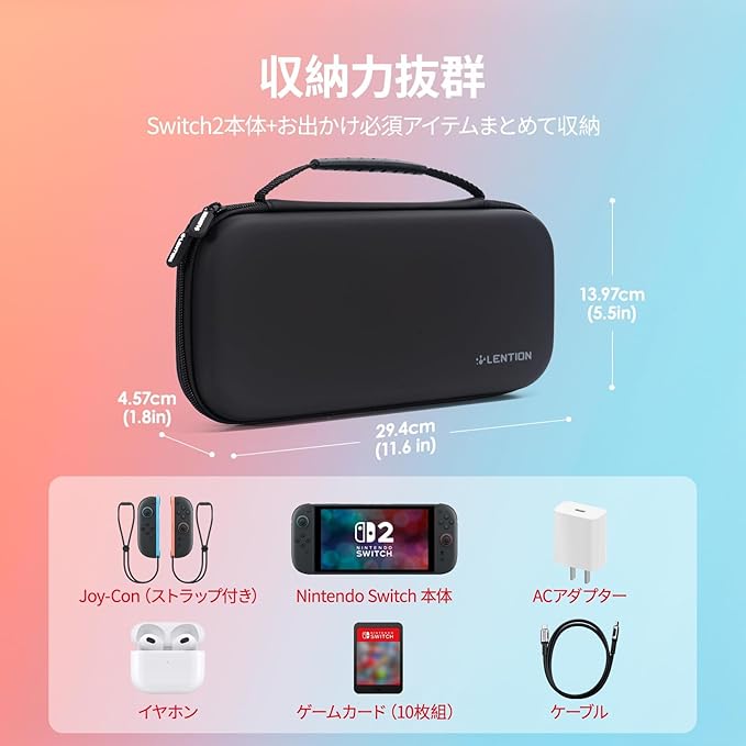 【Switch 2 本体専用設計】switch 2 ケース専用サイズで画面キズ落下衝撃を防止で画面キズ・落下衝撃をガード。本体+周辺機器(ゲームカード10枚/Joy-Con/充電ケーブル)を軽量ボディに収納。旅行先でもサッと取り出していつでもゲームを楽しめる耐衝撃ケース。