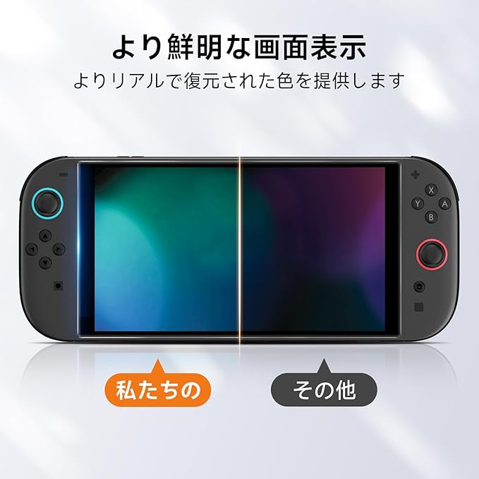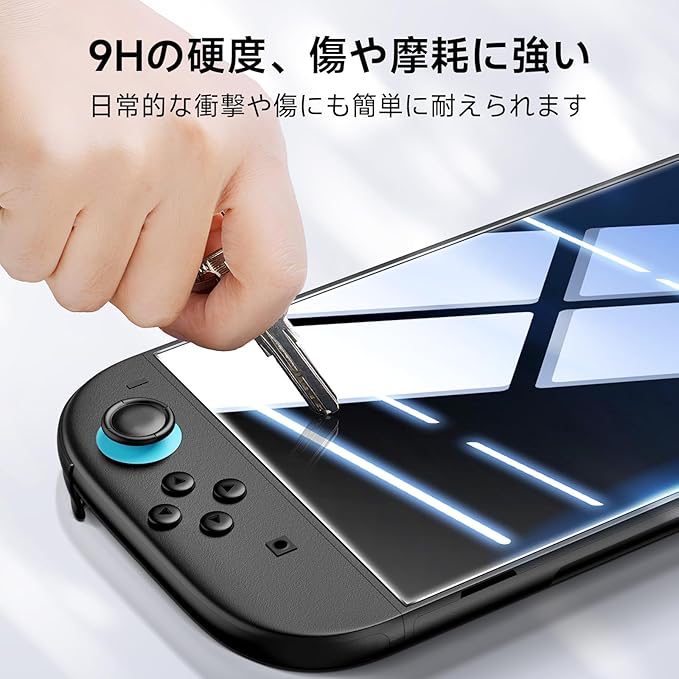 【9H硬度・飛散防止】高品質素材を使用し、傷や衝撃から スイッチ 2のスクリーンを強力に保護。9H硬度のガラスでカッターや鍵などによる傷を防ぎ、万が一割れた場合でも飛散防止加工により安全に使用できます。