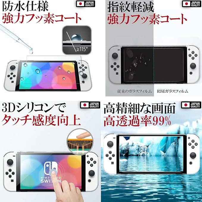 【対応機種及び仕様】Switch 有機EL モデル/Switch OLED 専用 クリアガラスフィルム。安心の日本製素材 国産AGCガラスを使用。第3世代製法の最新技術のW硬化製法(2次強化)ガラスで耐衝撃性を強化。