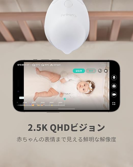 【2.5K QHDナイトビジョンカメラ】超高精細な2.5K解像度のライブ映像とクリアなナイトビジョン機能により、どんな状況でも赤ちゃんの様子をはっきりと確認できます。モニターには内蔵の