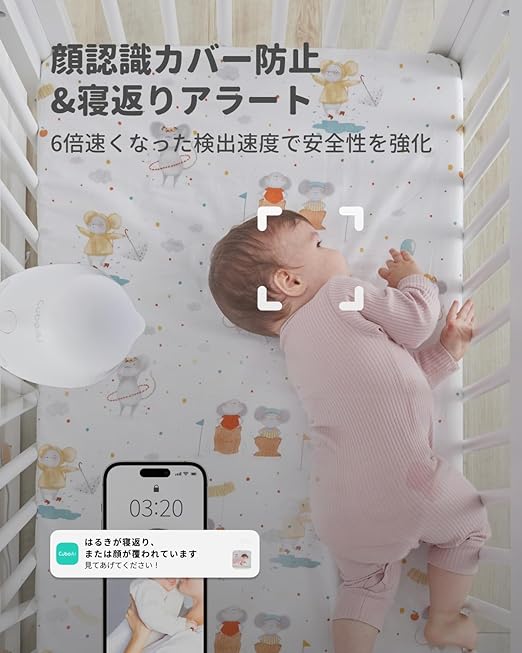 【睡眠安全アラート】改良されたAI検知技術により、赤ちゃんの顔が覆われている場合や寝返りをした場合を正確に検知します。赤ちゃんが必要な時にすぐに通知を受け取れるので、ママパパも安心してお休みいただけます。また、AI技術を活用し、追加のアクセサリーなしで赤ちゃんの成長を自動的に追跡し、身長を測定することができます。