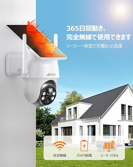 【完全無線・設置簡単・超低電力消耗】 防犯カメラとソーラーパネルは完全一体型で配線もなく、取り付け工事も不要ですので、簡単に設置ができます。 大容量充電池とWi-Fi接続で完全無線のドーム型防犯カメラです。動体検知録画や映像視聴時などの動作時以外には待機状態となり5、超低消費電力モードになります。大容量充電池を搭載し、USBや太陽光充電でも安心の電力持続時間を確保しました。初搭載の最新チップを採用し画像処理と電力消費が50%向上しました。誤報は減少させながら、動体を感知すると録画を開始するので