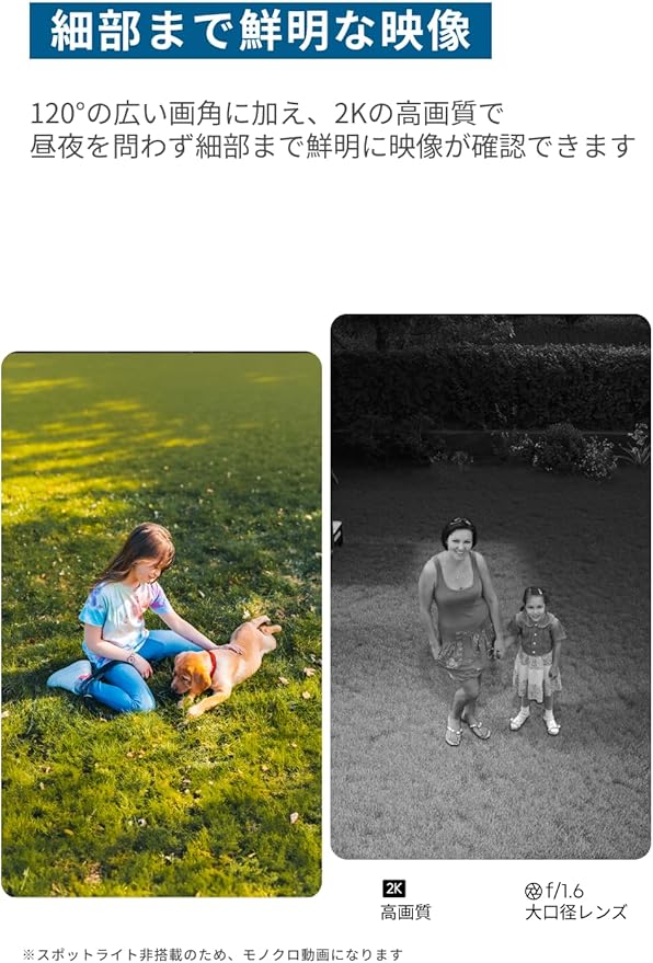 細部まで鮮明な映像:20°の広い画角に加え、2Kの高画質で昼夜を問わ