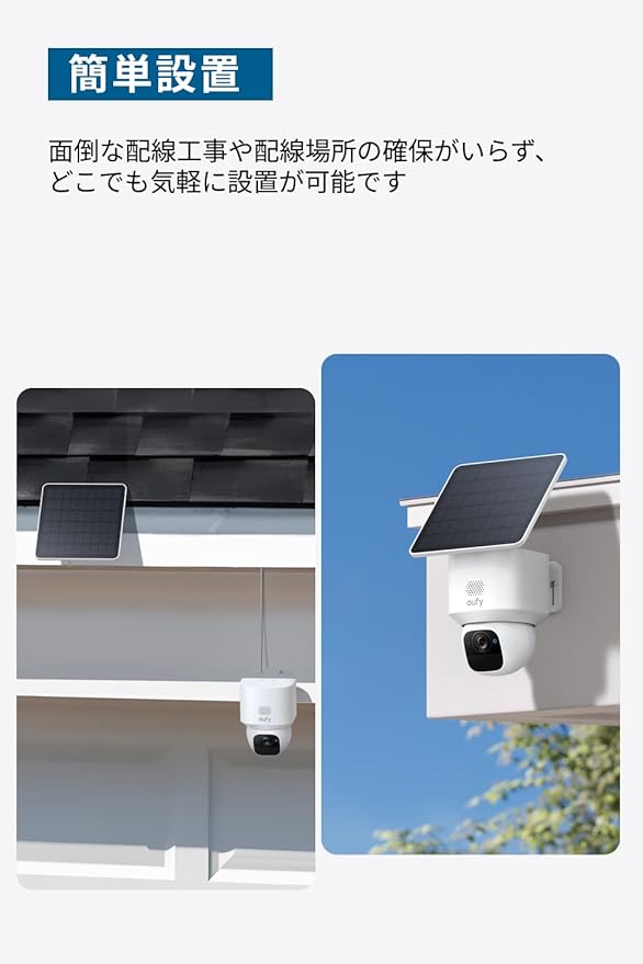 ソーラー充電:カメラ本体から取り外して設置可能なソーラーパネルと内蔵バッテリーを搭載。ソーラー充電により、充電の煩わしさがありません。