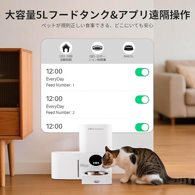 【5L大容量&スマホ連携で安心スマート給餌】 5Lの大容量フードタンクで長時間の外出や出張時も安心して定量給餌が可能。設定した時