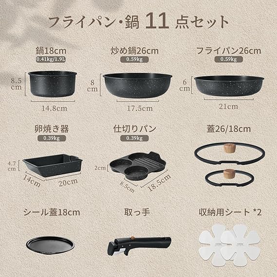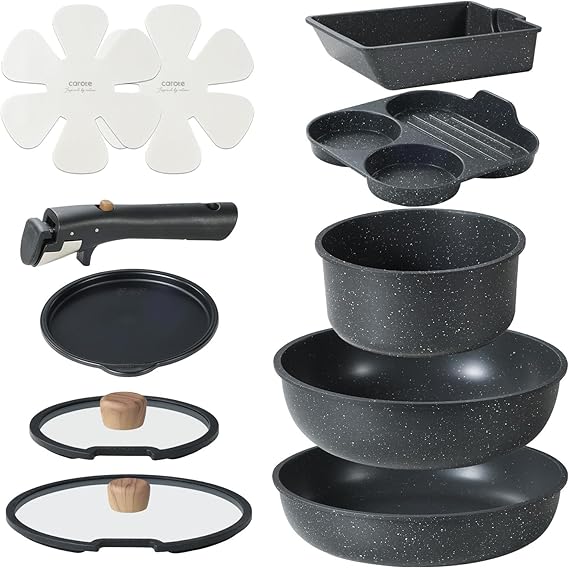 CAROTE カローテ フライパン セット 11点 IH?ガス火対応 PFOAなどの有害物質不使用 5層構造 鍋セット 卵焼き 仕切りフライパン 取っ手のとれる マーブルコート こびりつきにくい 手入れ簡単 一年保証 ブラック 黒 Grain グレインシリーズ a